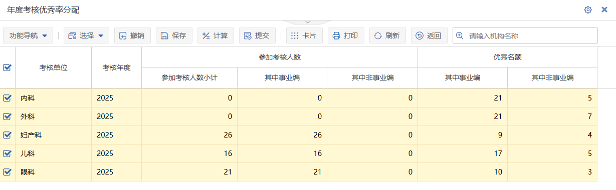 “優(yōu)秀”名額的分配是考核中最敏感、最易引發(fā)矛盾的環(huán)節(jié)。宏景系統(tǒng)的智能化校驗(yàn)機(jī)制,如同一位鐵面無(wú)私的“公正官”,將政策要求內(nèi)置為系統(tǒng)規(guī)則。它可根據(jù)預(yù)設(shè)的優(yōu)秀率,自動(dòng)為每個(gè)考核單元(如科室、系所)計(jì)算并鎖定上限名額。特別支持對(duì)在編與非編人員分類管控,既滿足精細(xì)化管理要求,也徹底杜絕了因人為調(diào)整可能帶來(lái)的不公,讓每次評(píng)選結(jié)果都經(jīng)得起質(zhì)疑,顯著提升考核的公信力。